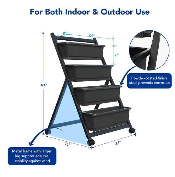 Made of coated steel with stable wide-angle support at the bottom to ensure stability for the total weight of soil, water and plants, even in windy conditions.