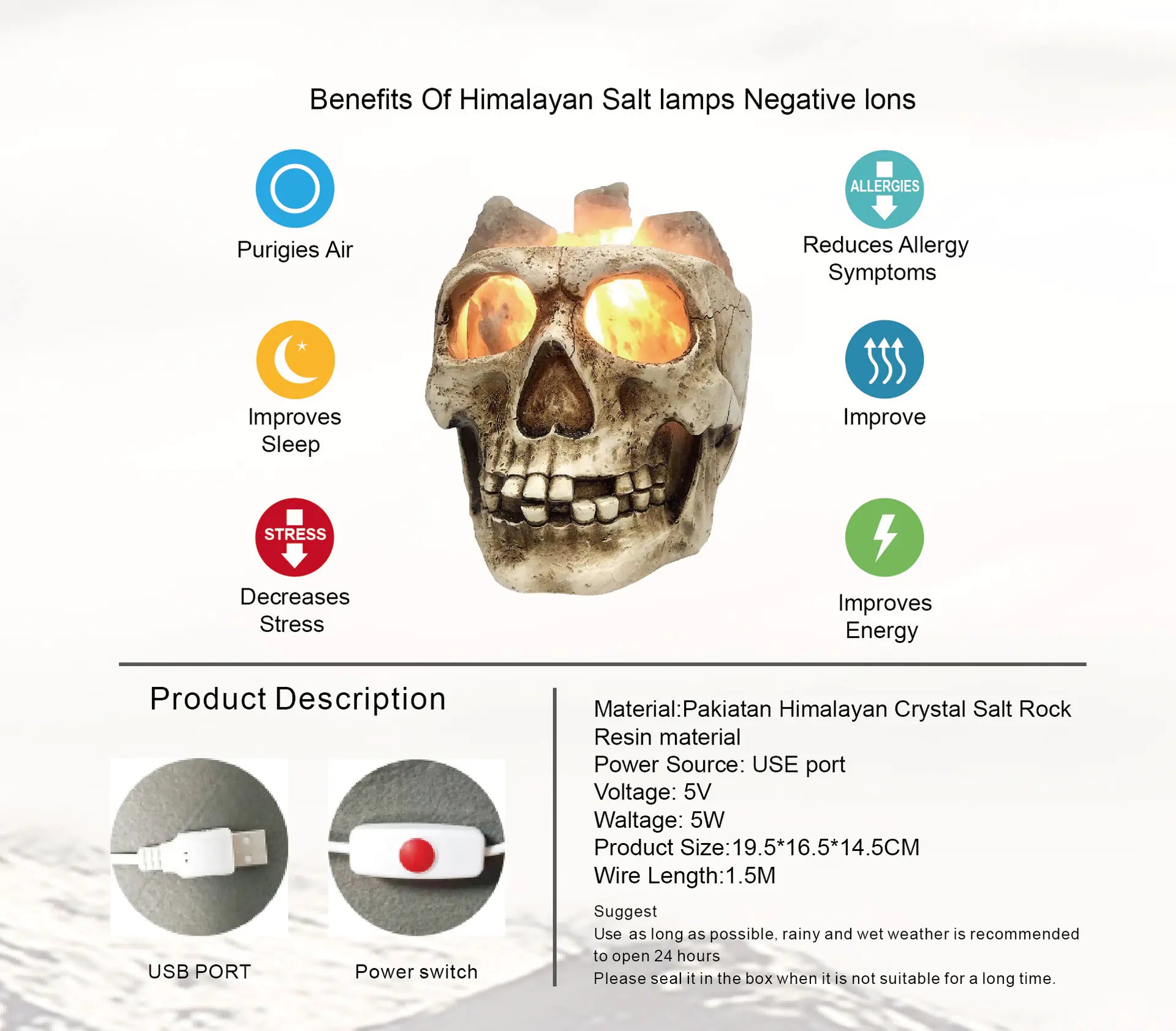 Our unique LED Skull Salt Lamp is designed to be a captivating blend of art and function. This resin lamp features a charming cartoon skull design that adds a touch of whimsy to any room, making it perfect for those who appreciate a hint of the macabre in their decor with enchanting appeal!